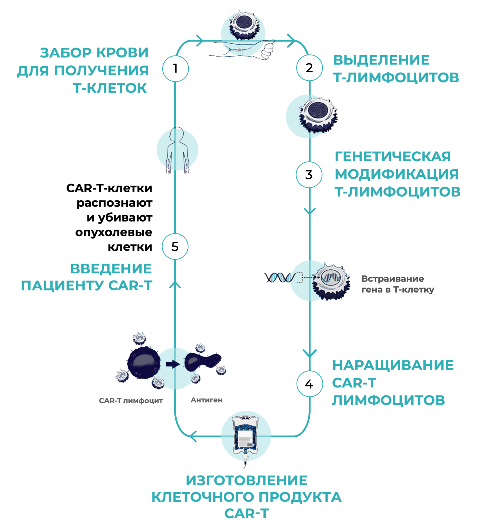 «Перепрограммированные» лимфоциты приобретают способность эффективнее распознавать и уничтожать опухолевые клетки, что делает CAR-T терапию настоящим прорывом в терапии онкологических заболеваний